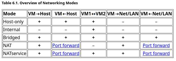 有关在不同的网络模式下,虚拟机、主机、局域网/外网之间的可访问规则,官方文档给了一个非常好的图表,这里也给大家看下: